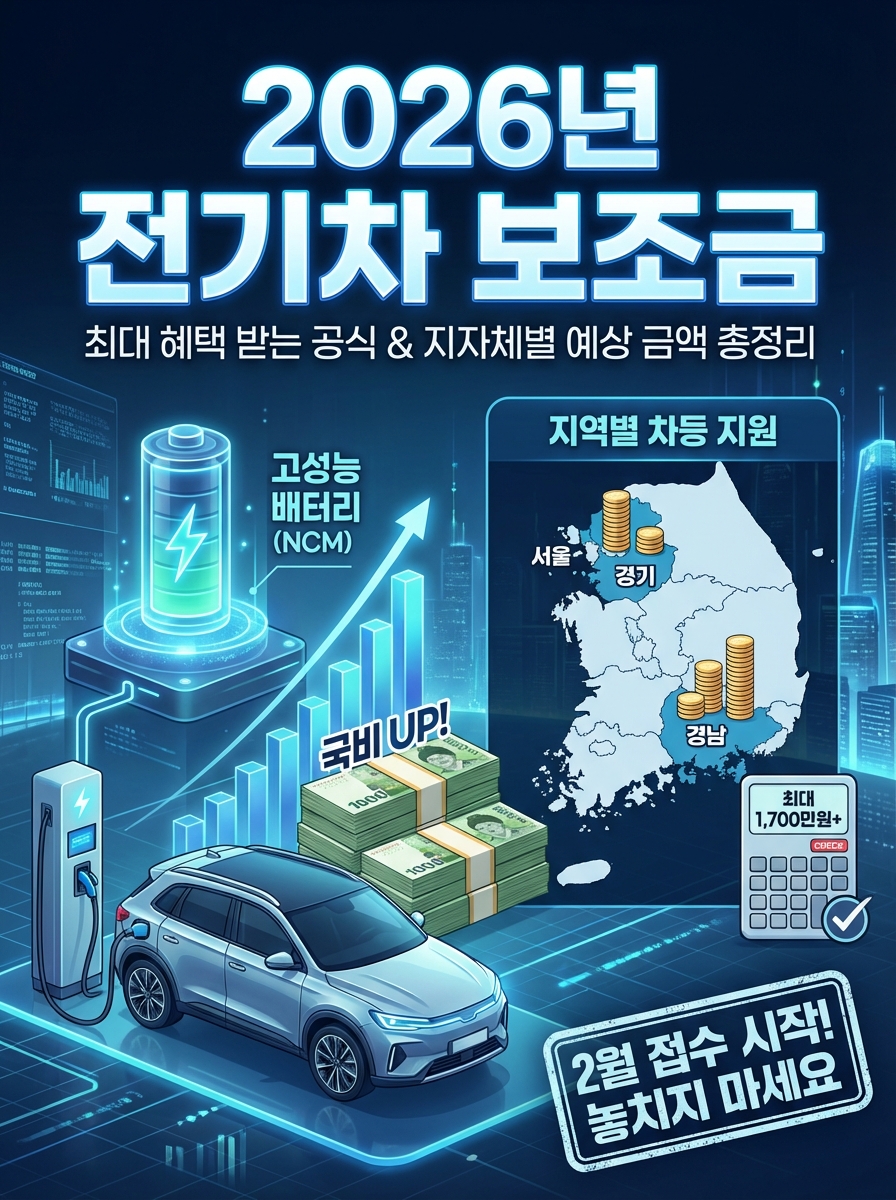 2026년 전기차 보조금은 1월 환경부 지침 발표 → 2월 중순 지자체별 모집 공고 순으로 진행됩니다. 예산은 한정되어 있고, 특히 보조금이 많은 지역은 상반기에 예산이 70% 이상 소진됩니다.